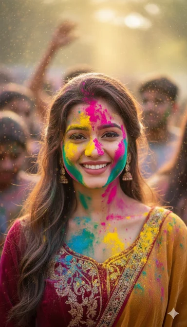 cinematic portrait of a young Indian woman celebrating Holi festival, colorful gulal powder (bright pink, yellow, blue, green, orange) naturally smeared and splashed on face, beard, hair and white kurta, soft golden hour sunlight, warm glowing skin tones, shallow depth of field, creamy bokeh background, festival crowd softly blurred behind, floating color dust particles in air, sharp focus on eyes, natural skin texture, detailed facial features, realistic beard texture, vibrant festival colors, DSLR photography, 85mm lens, f/1.8 aperture, high dynamic range, professional color grading, photorealistic, joyful expression, Instagram aesthetic, ultra high resolution, 8k detail