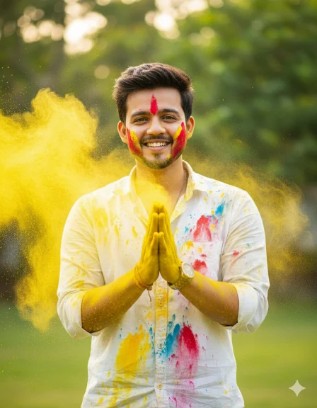 Ultra-realistic Holi festival portrait using my uploaded photo as the face reference, joyful young man smiling naturally, hands pressed together in front of chest covered in bright yellow Holi powder, vibrant yellow color powder exploding and flying across the frame, white button-up shirt splashed with multicolor paint stains (yellow, red, blue), red powder streak on one cheek, playful festive expression, dynamic powder particles frozen mid-air, outdoor garden background softly blurred with green foliage, bright natural daylight, warm tones, cinematic lighting, shallow depth of field, sharp focus on face, ultra-detailed skin texture, high shutter speed capture, 85mm lens, f/1.8, professional DSLR photography, vibrant colors, high contrast, 8K resolution, realistic fabric texture, energetic Holi celebration atmosphere, editorial photography style