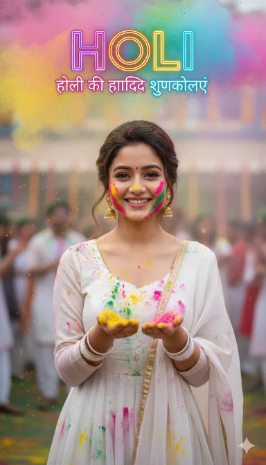 Use my selfie as the exact face. 2:3 ultra-real Holi photo of a young Indian girl, camera-facing. White suit with dupatta, light red/yellow/green/blue color marks, earrings, white bangles, small red tilak, light gulal on cheeks and hands, both hands slightly raised with color.