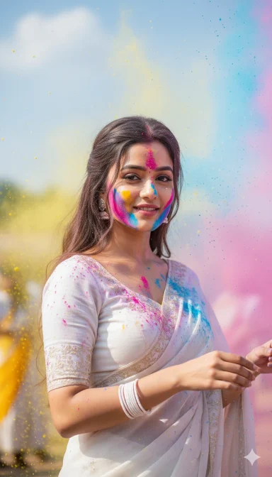 “Create a cinematic, ultra-realistic image of a young Indian girl celebrating Holi. She wears an embroidered white saree and matching blouse, with long hair and white bangles. Her face is dusted with pink and blue powder, and vibrant colored powder (red, yellow, blue) floats in the air. She has a gentle smile, one hand slightly raised, also covered in powder. The setting is outdoors with a light blue sky, shallow depth of field, and a festive atmosphere. Keep the girl’s face unchanged, focusing on realistic skin texture, vibrant yet natural colors.”